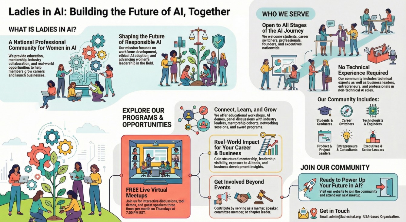 Ladies in AI is a national professional organization for women who are building, leading, learning, and innovating in artificial intelligence and emerging technologies across the United States. We provide education, mentorship, industry collaboration, and real-world opportunities that support career advancement, business growth, and responsible AI adoption.